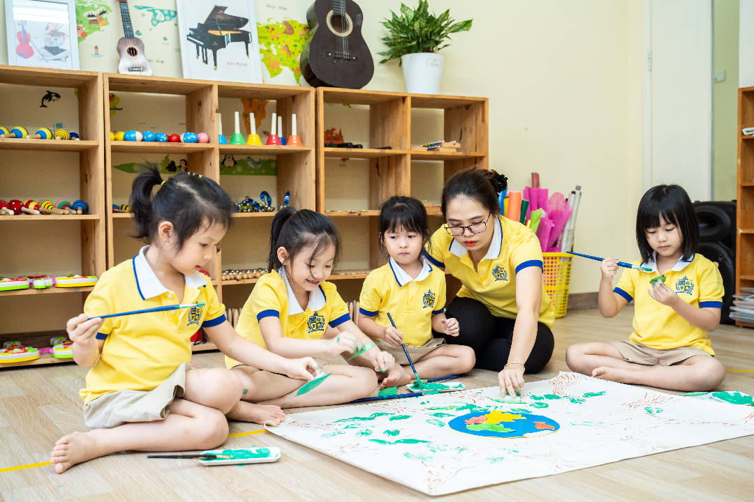 Mỹ thuật: Trẻ được khuyến khích và tự do phát triển trí tưởng tượng phong phú và khả năng sáng tạo để biểu đạt ý tưởng, cảm xúc của mình thông qua các hoạt động như vẽ, tô màu, cắt dán, nặn bột, nặn đất sét.