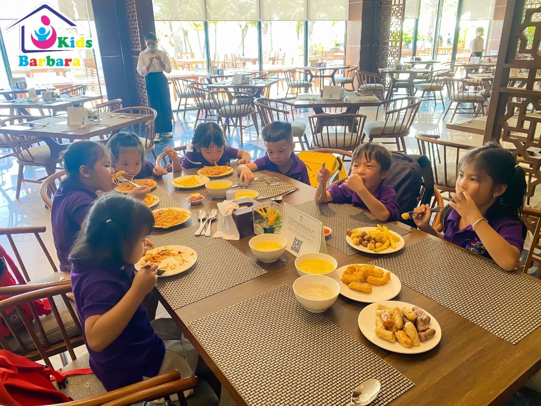 Ở Trường Mầm Non Barbara Kids CS1 - Vĩnh Điềm Trung, Nha Trang, một ngày con ăn 3 bữa chính: sáng, trưa, xế và 2 bữa phụ: 9h uống nước ép trái cây và tráng miệng: yaourt với trái cây sau khi ăn xế.