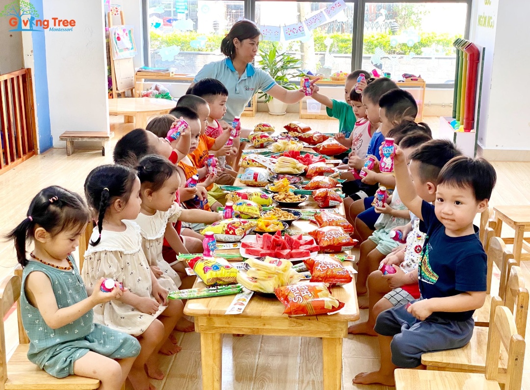 - Ở Trường mầm non Giving Tree Montessori - Đức Giang, Long Biên, ngoài việc được hướng dẫn lựa chọn và cách sử dụng những bộ giáo cụ phù hợp với giai đoạn nhạy cảm, trẻ còn được tham gia rất nhiều hoạt động ngoại khóa hàng ngày: Âm nhạc, thí nghiệm khoa học, thể thao giải trí, múa và các hoạt động dã ngoại.