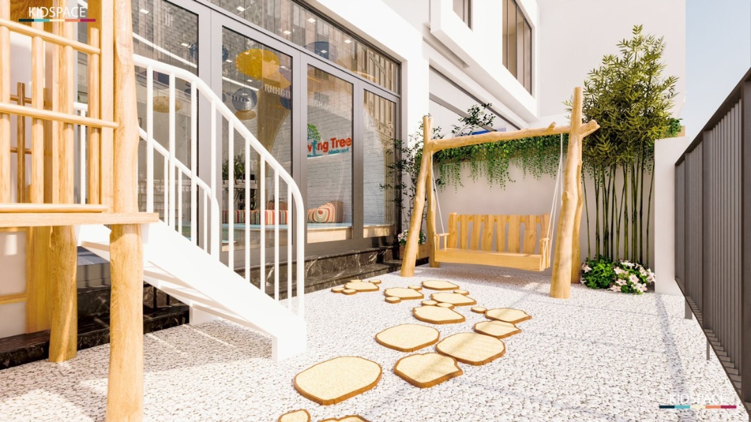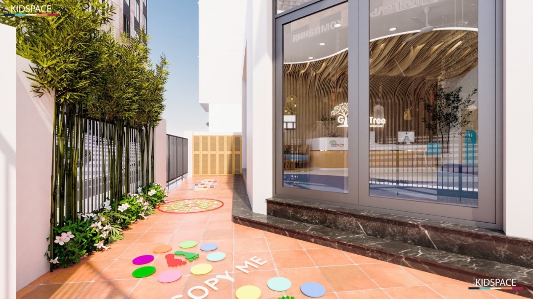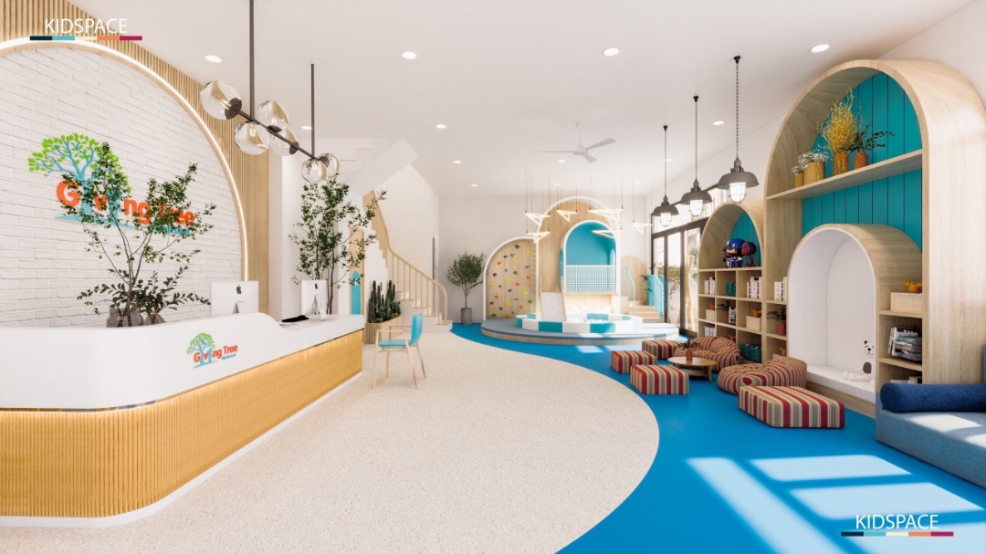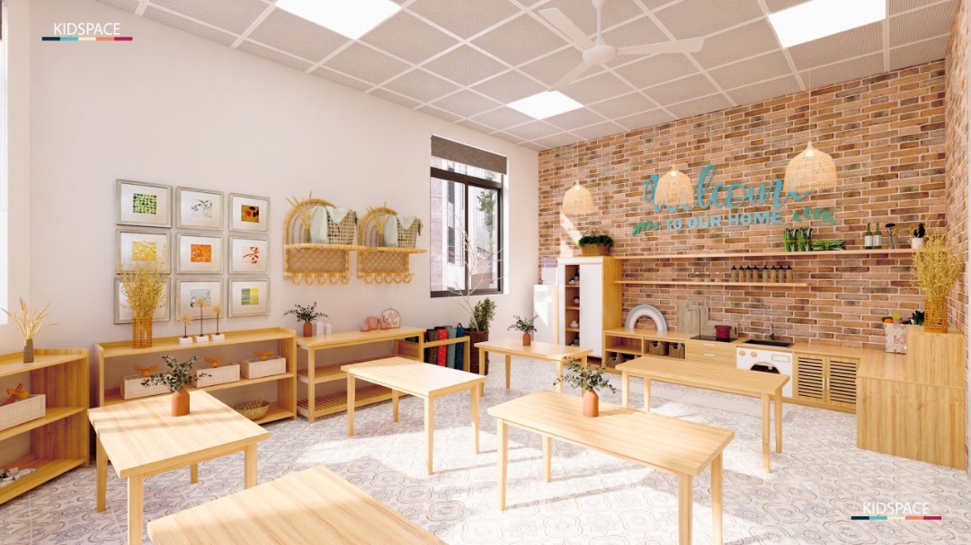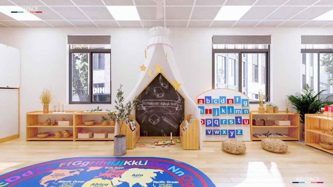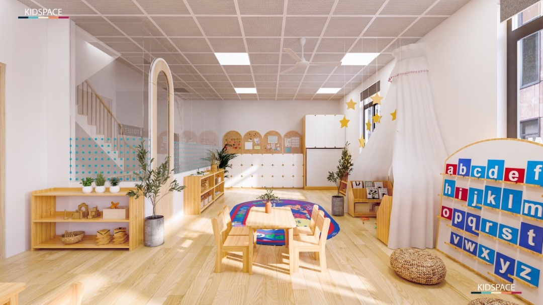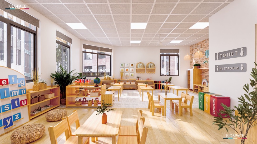 - Trường mầm non Giving Tree Montessori - Đức Giang, Long Biên hệ thống phòng học rộng 100m2, không gian rộng rãi, thoáng mát, thiết kế hiện đại, bắt mát phù hợp với lứa tuổ mầm non.