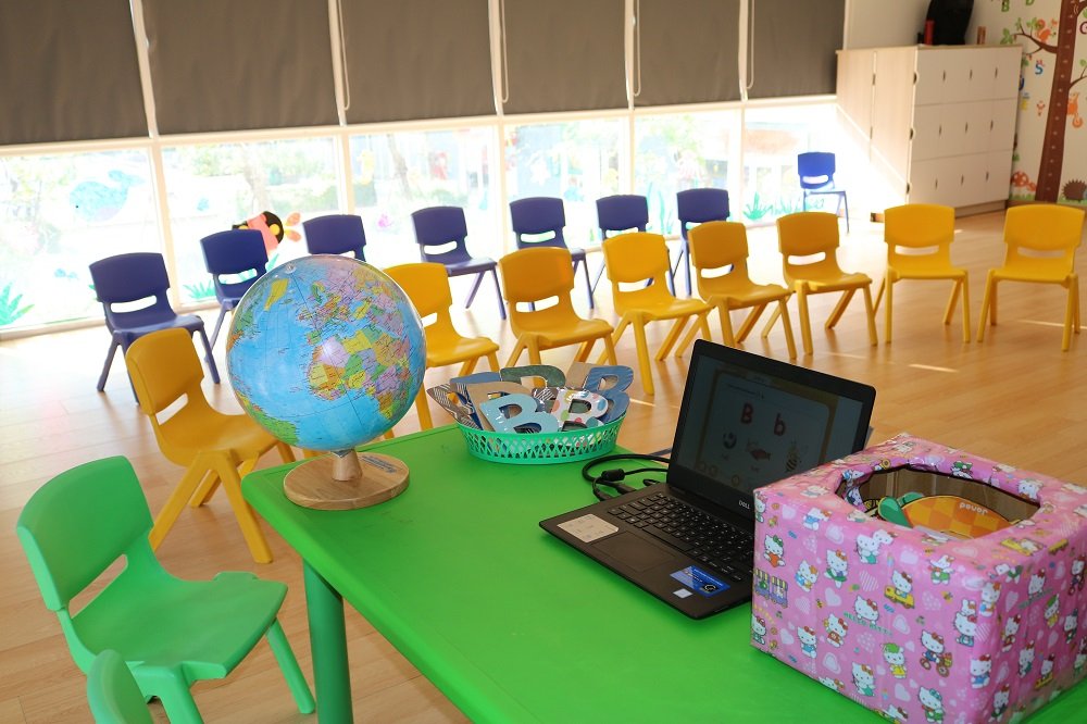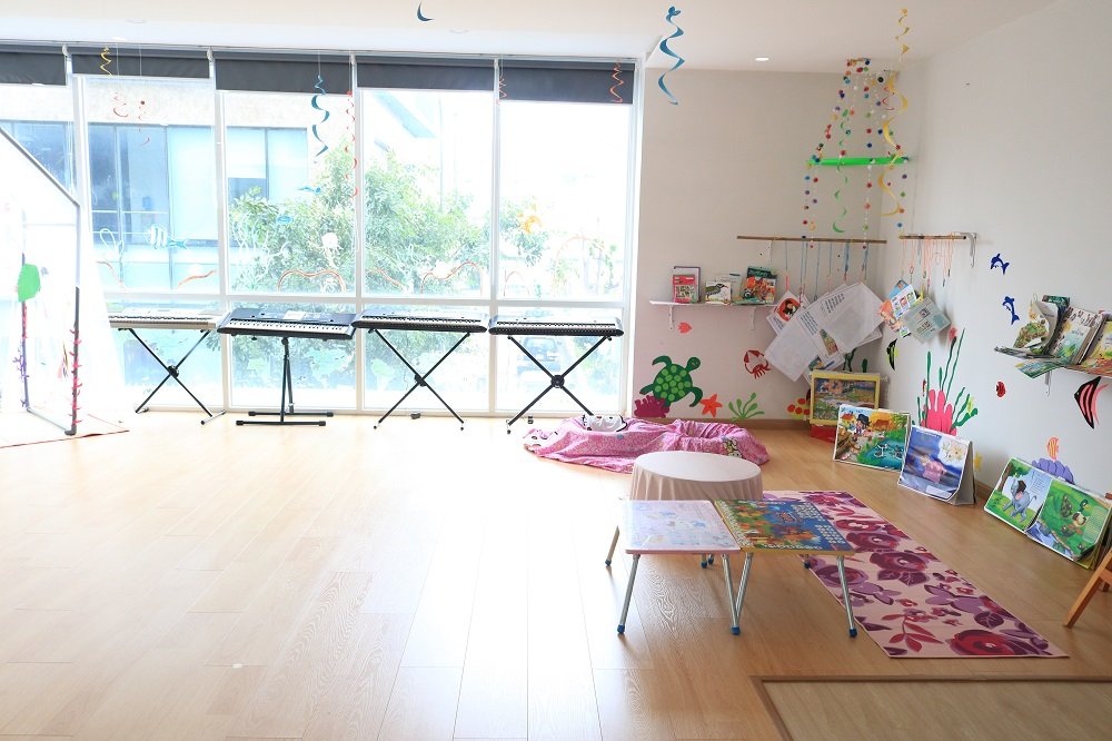 - Phòng Anh văn; Trẻ được học với giáo viên nước ngoài với các môn học như STEM, ngữ âm, từ vựng, ... với các học cụ thiết kế riêng phục vụ cho từng tiết học giúp trẻ tiếp thu nhanh và hiệu quả hơn.