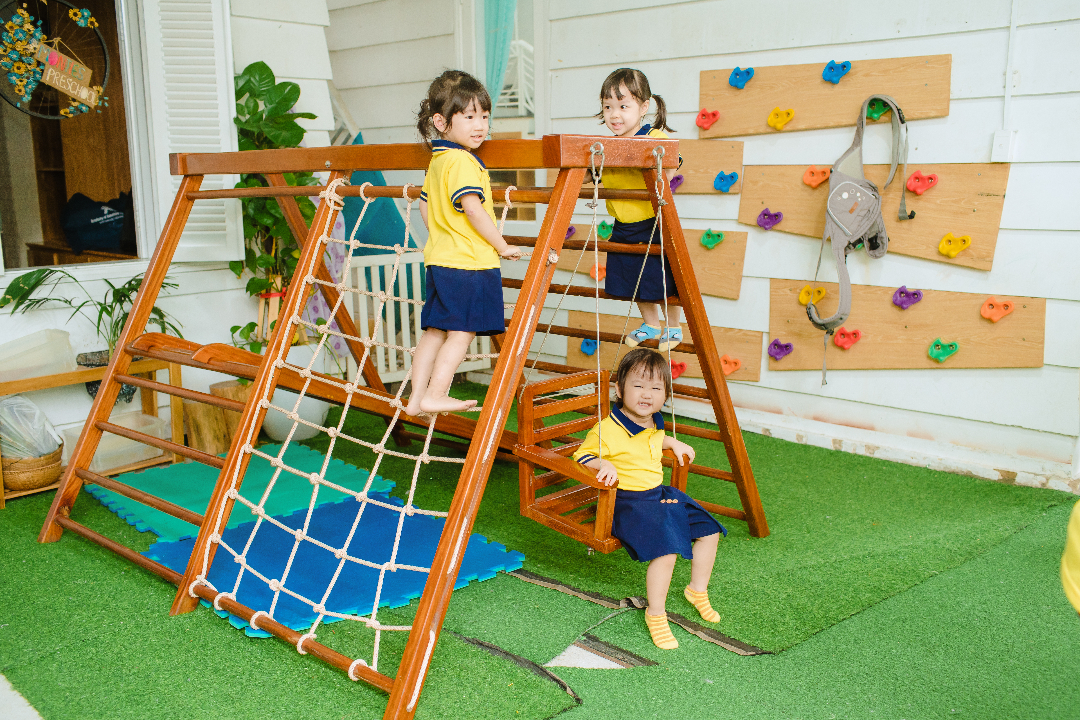- Sân chơi tuy nhỏ xinh nhưng có mái che được kéo ra để đón ánh sáng mặt trời, đồ chơi vận động ở sân phù hợp với nhiều độ tuổi. Các con được hoạt động tự do nhưng vẫn giữ được quy tắc tôn trọng môi trường và mọi người xung quanh.