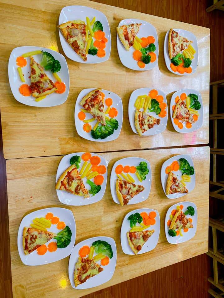 Ngày bé ăn 3 bữa chính và 2 bữa phụ. Thực phẩm sạch, dinh dưỡng cân đối và đầy đủ.