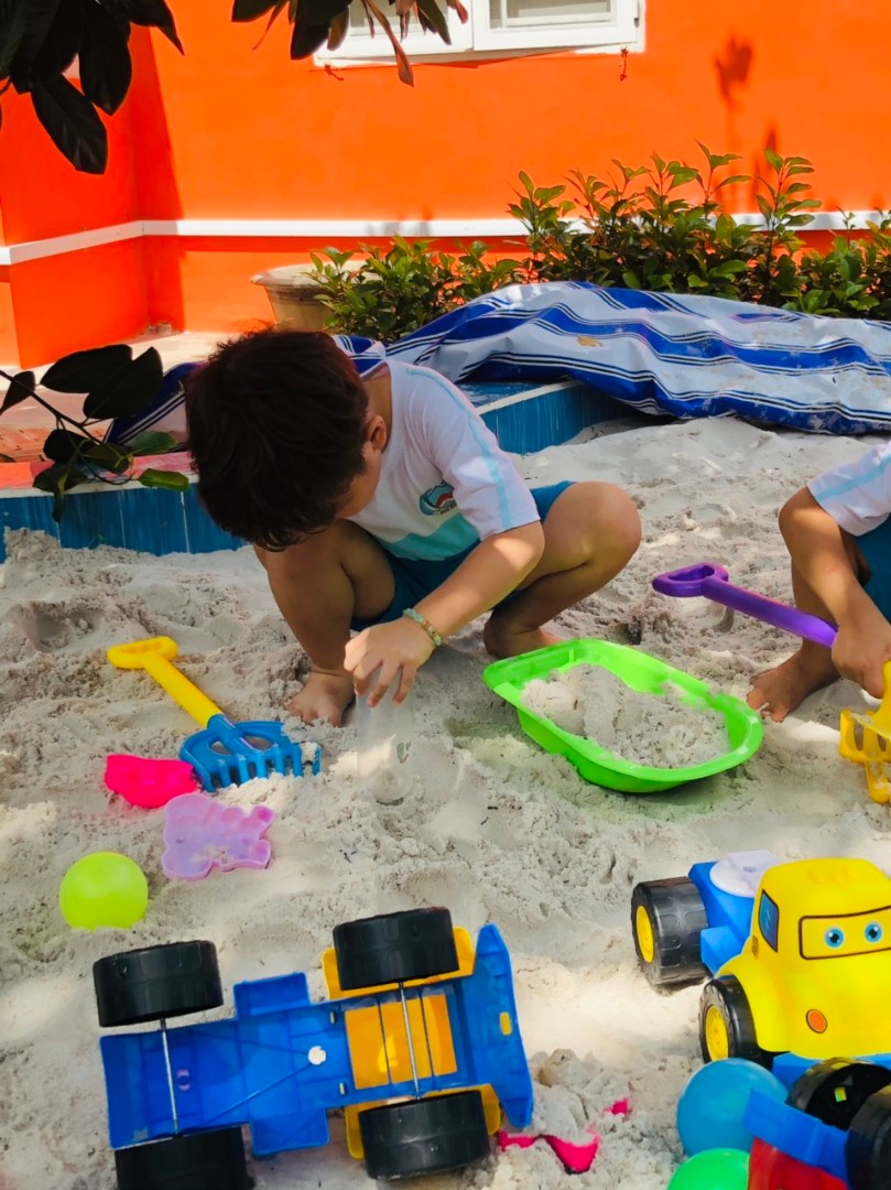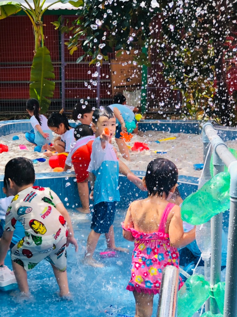 Khu chơi cát, chơi nước, vườn rau - nuôi thú.