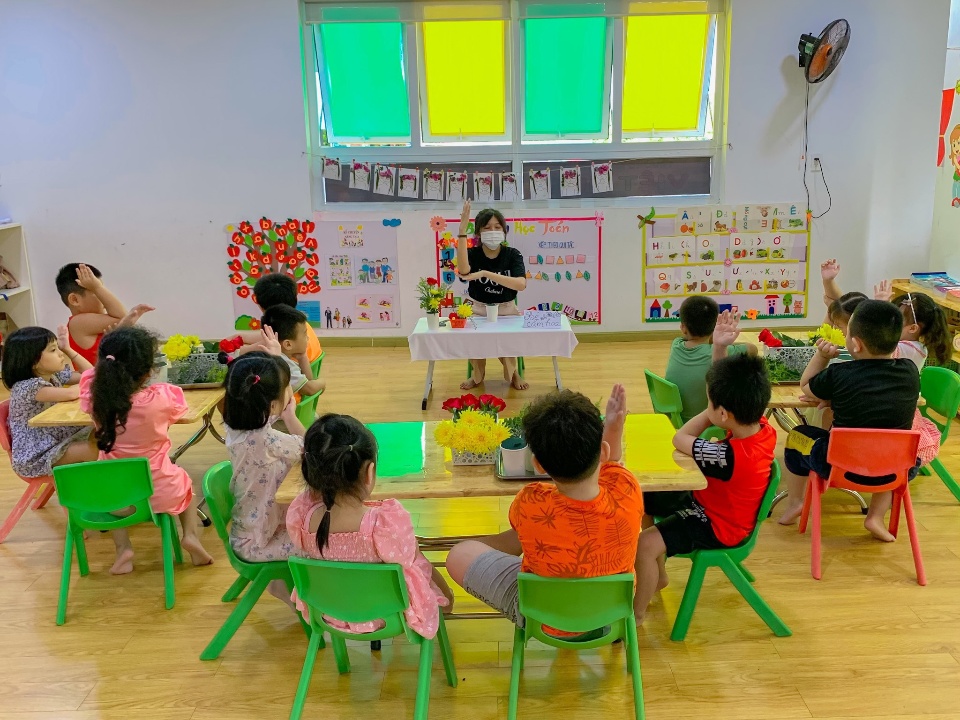 - 1 lớp lá: được trang bị máy điều hòa, tivi, máy vi tính, giường , tủ, gối, kệ đồ chơi, đồ dùng dạy học hiện đại, đầy đủ ...phù hợp cho trẻ hoạch động.