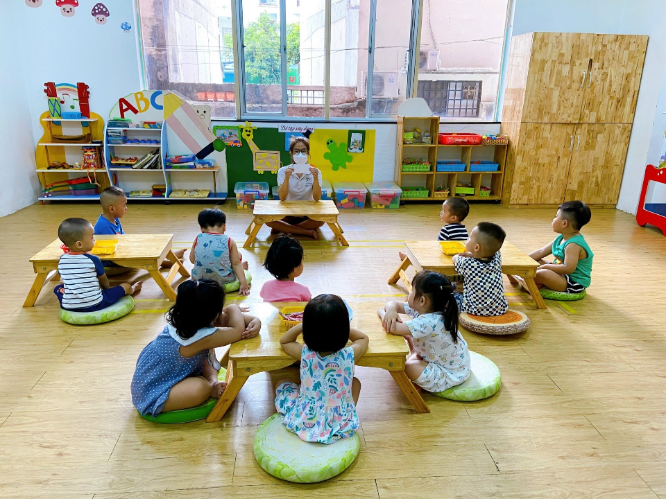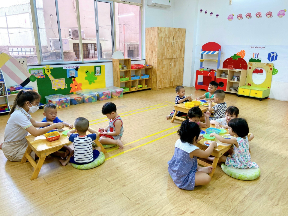 - 1 lớp 25-36 tháng: được trang bị máy điều hòa, tivi, máy vi tính, giường , tủ, gối, kệ đồ chơi, đồ dùng dạy học hiện đại, đầy đủ ...phù hợp cho trẻ hoạch động.