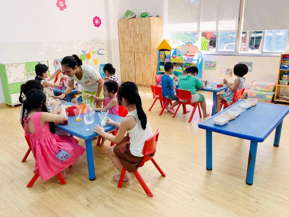 - Mỗi lớp có nhà vệ sinh riêng rộng rãi, sạch sẽ, khô thoáng, có trang bị máy nước nóng và đầy đủ trang thiết bị phục vụ cho việc chăm sóc bé